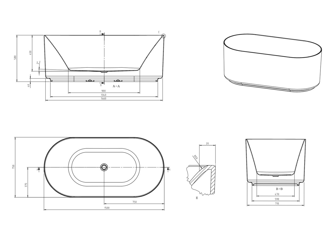 CELINE FREESTANDTING BATH 1500mm Gloss White With Overflow