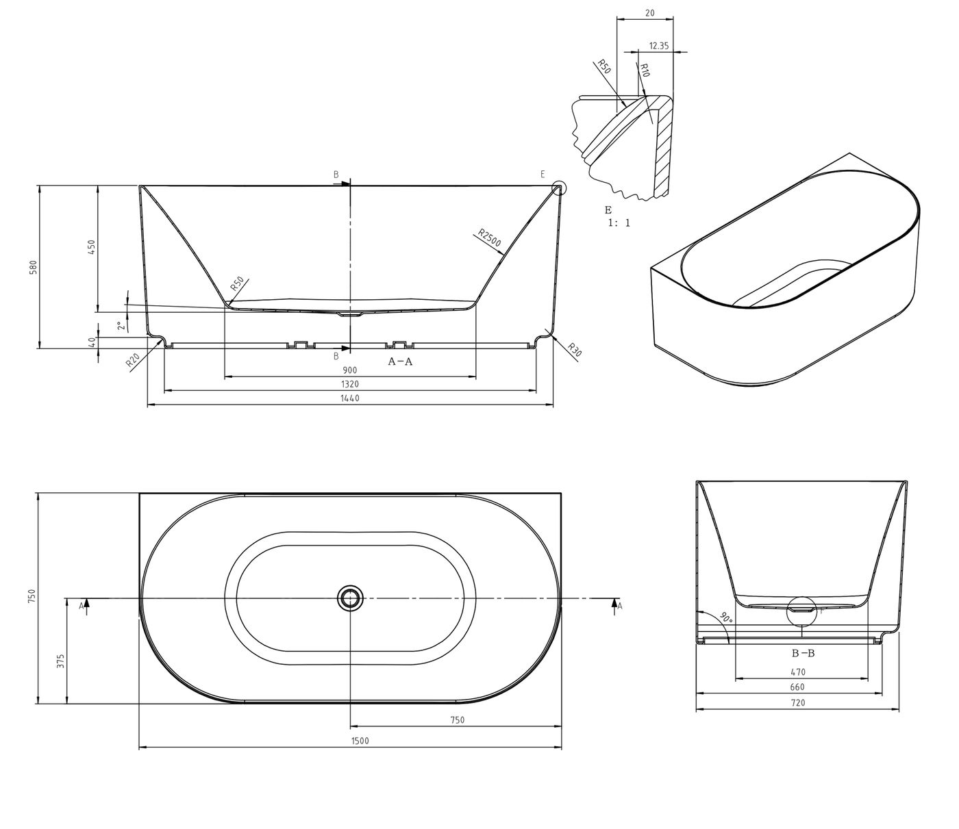 CELINE BACK-TO-WALL BATH 1500mm Matte White With Overflow