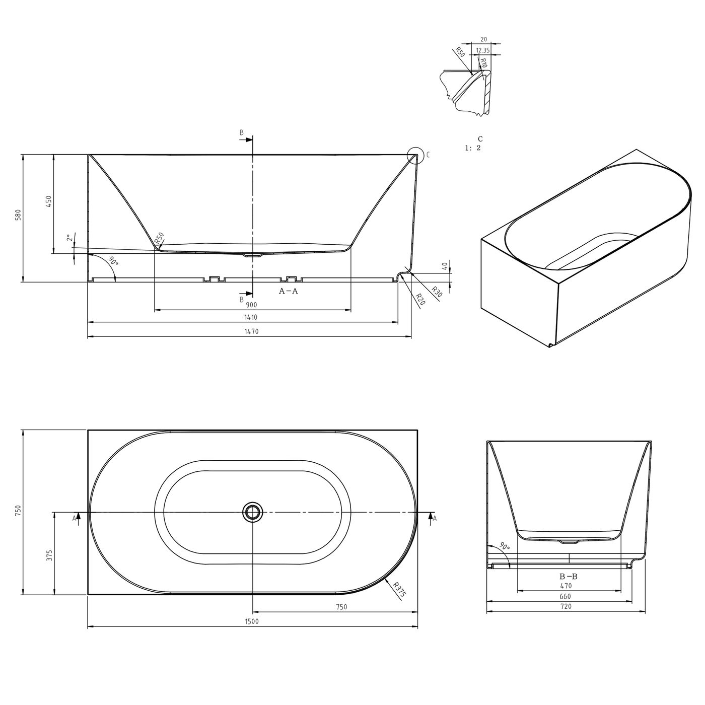 Size 1500x750x580mm