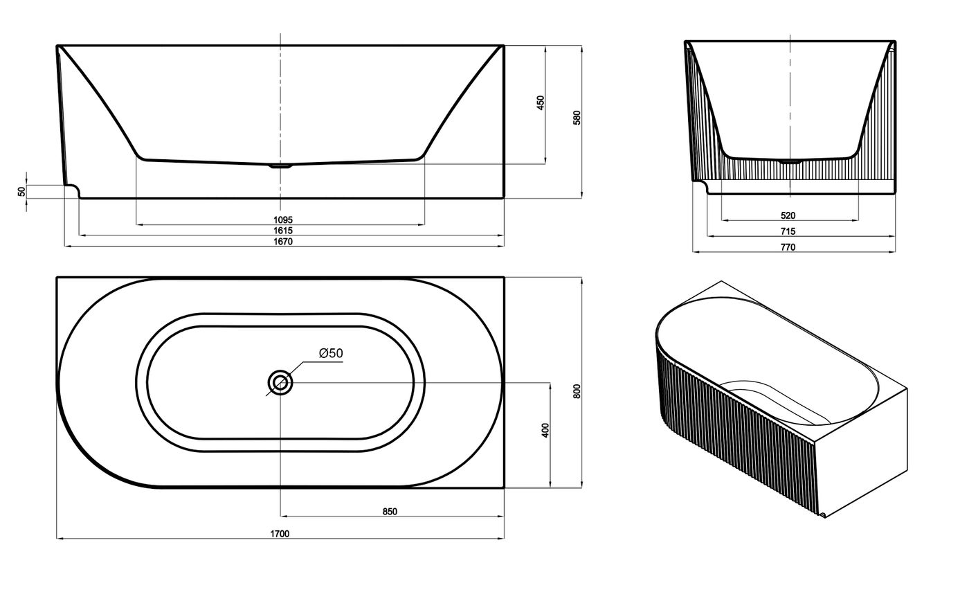 Attica Havana Right Corner 1700 Matte White Fluted Bath with Overflow