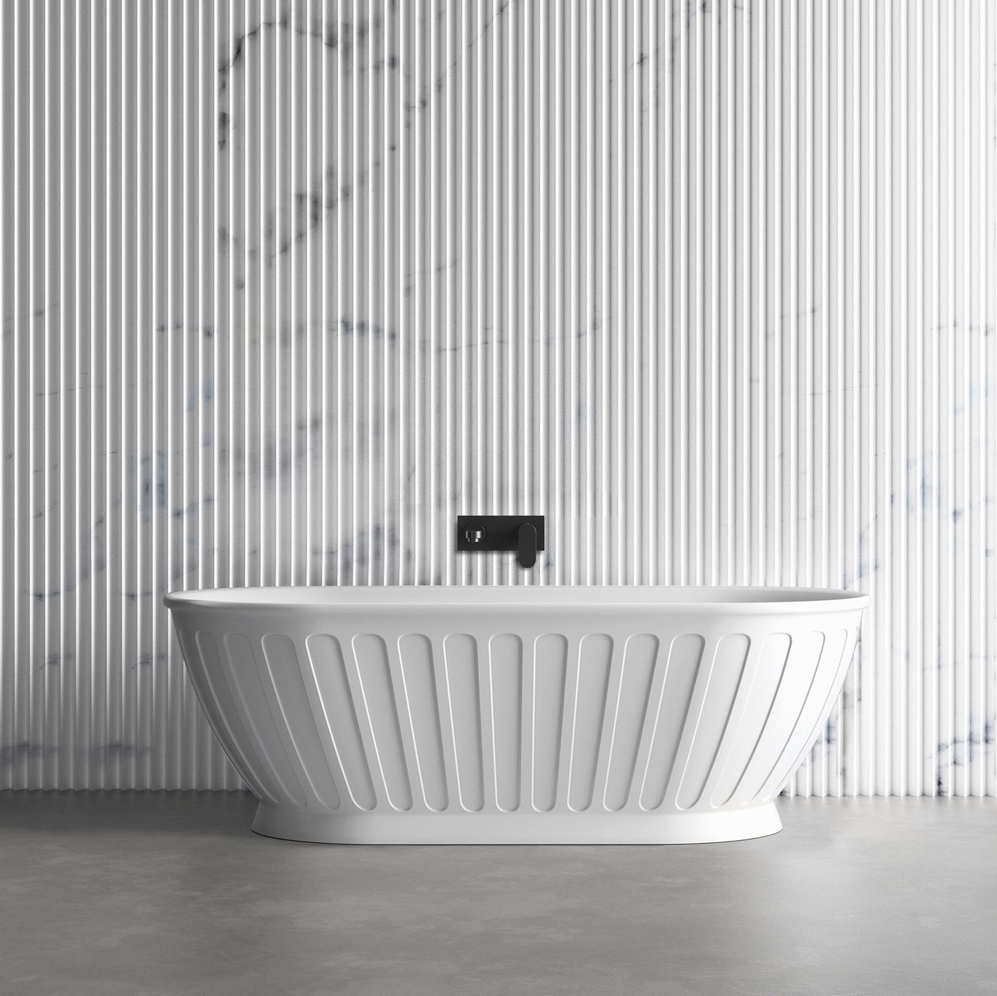 Kensington bath features a rolled top, fluted body design with a plinth detailed base.