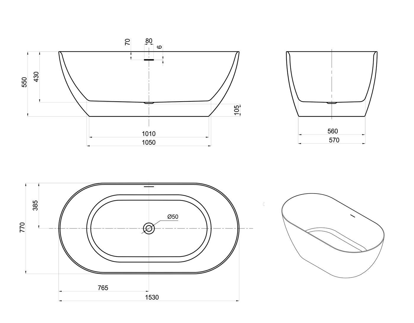 MANOLO FREESTANDING BATH 1530mm  Gloss White With Overflow