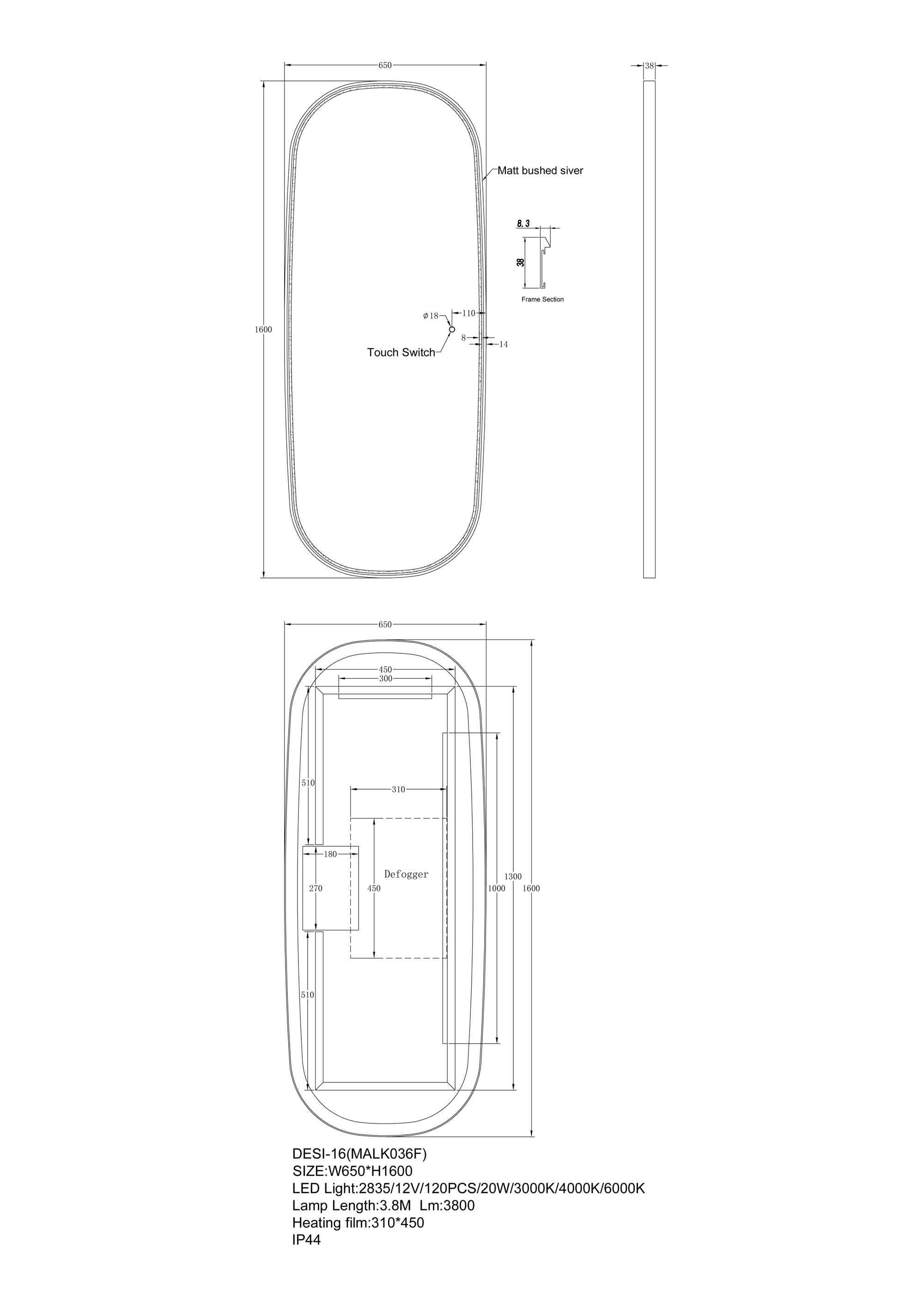 1600x650mm Framed LED Dressing Mirror