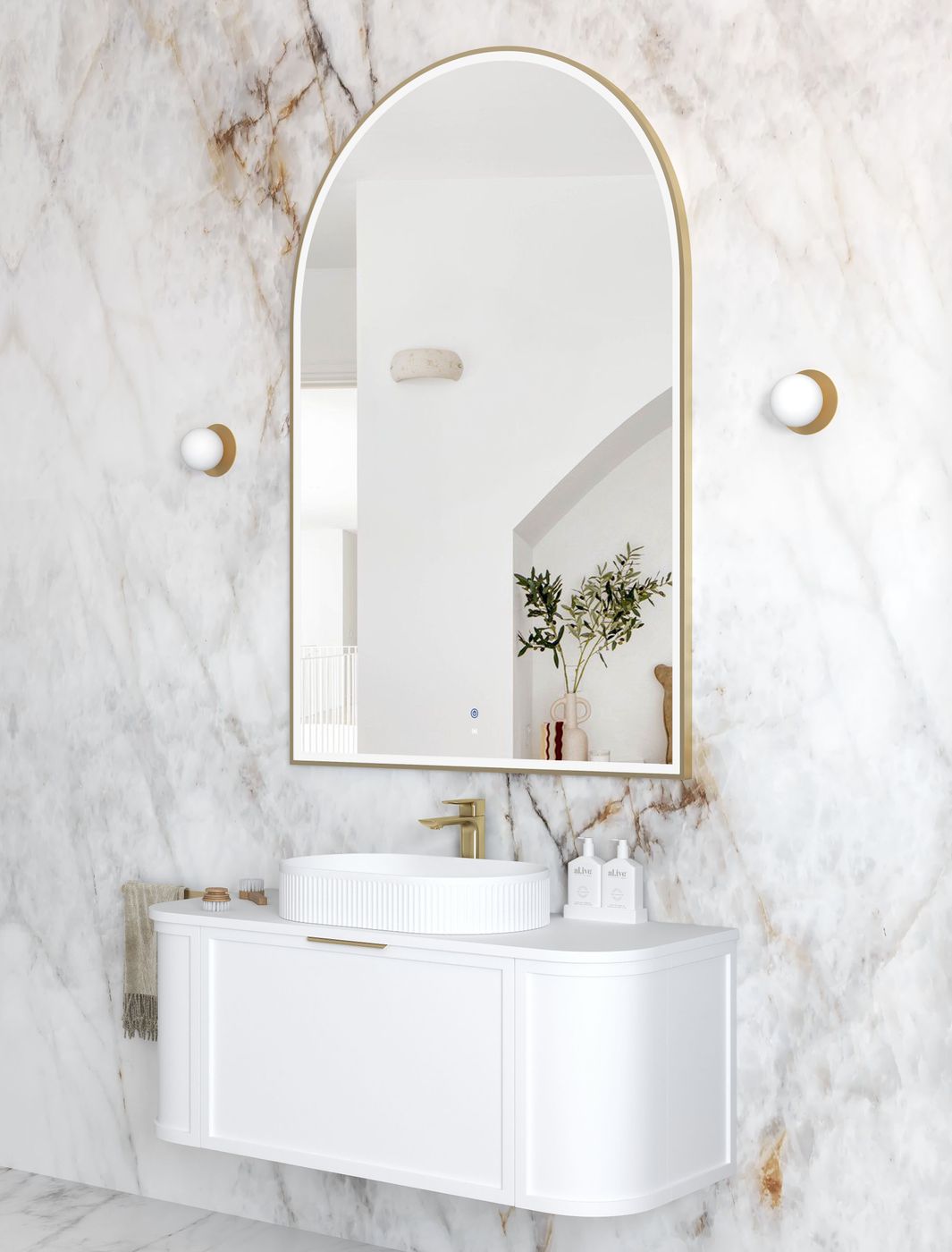 This Arch Mirror 1500 x 1000mm with Brushed Gold Frame delivers a bold architectural statement while providing premium functional lighting for modern bathrooms. Designed with a sleek Brushed Gold frame and front-lit LED illumination, this mirror enhances visibility for grooming tasks while creating a sophisticated ambient glow. Featuring advanced anti-fog technology and copper-free mirror construction, the Arch mirror ensures long-lasting clarity and durability in humid bathroom environments. The integrated motion sensor allows effortless hands-free operation, while adjustable colour temperature settings enable you to customise the lighting from warm to cool tones to suit your space and preferences. Perfect for pairing with our vanities and contemporary tapware finishes, the Archie mirror brings together modern styling, smart functionality, and everyday convenience for bathrooms, ensuites, and powder rooms.