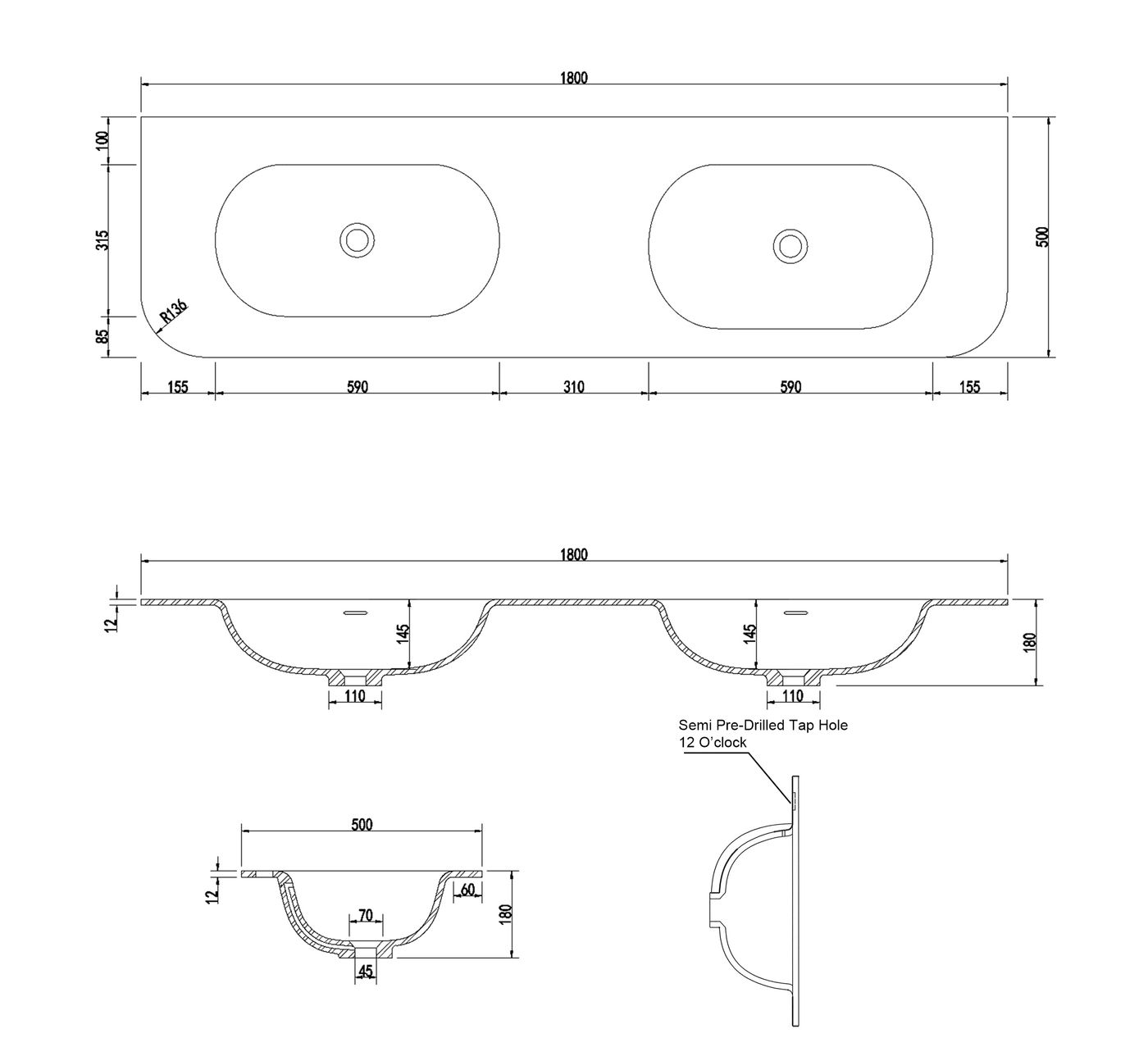 | Top | 1800x500x12mm Chloe Silk 12mm With Soft Oval Basin |