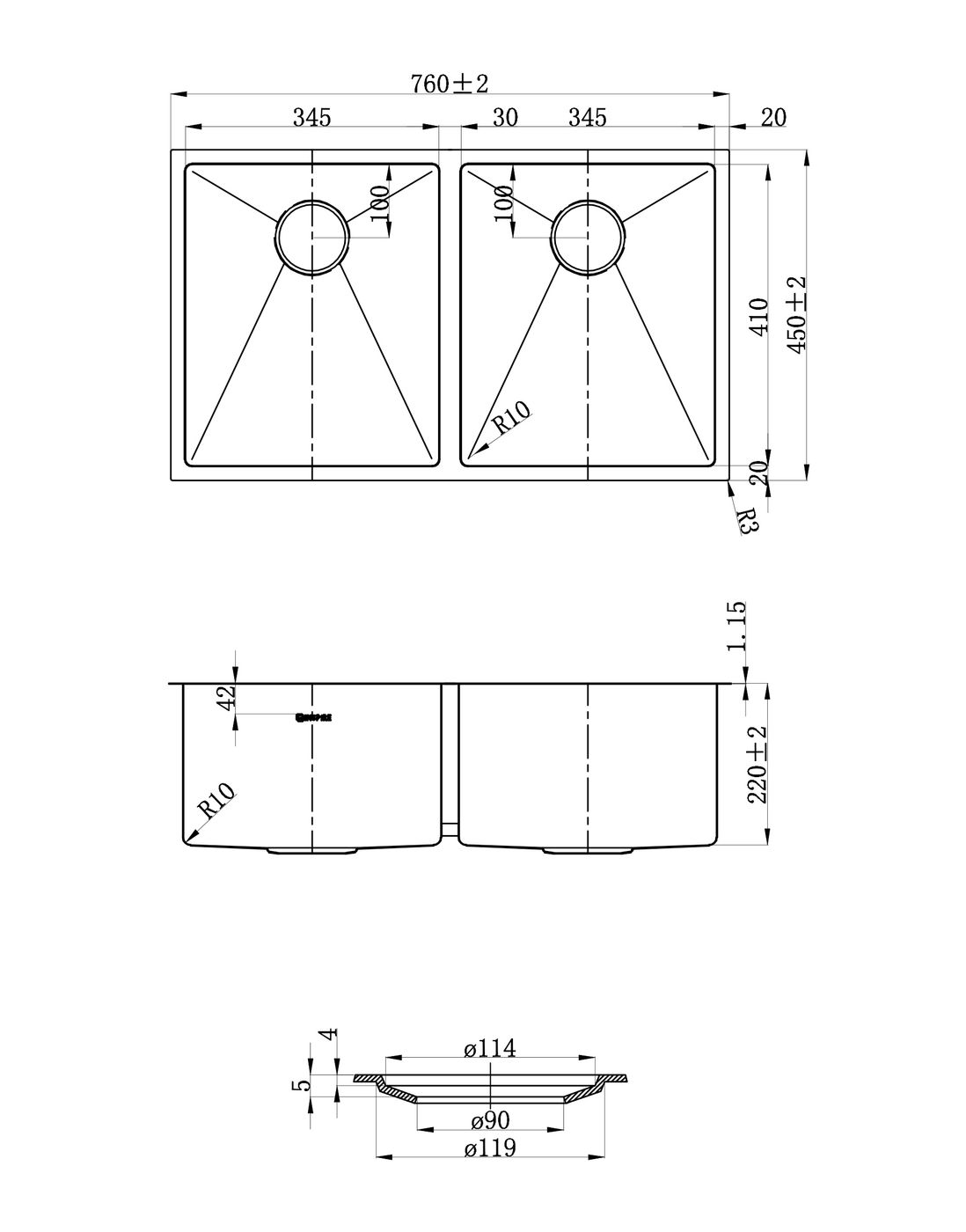 Double bowl handmade kitchen sink